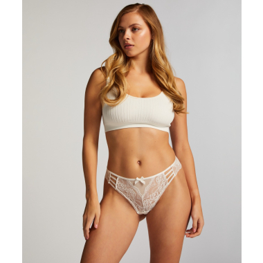 Νιώσε σέξι με αυτό το μπραζίλιαν! Είναι κατασκευασμένο από εξαιρετικά μαλακά υλικά - ρομαντική δαντέλα -cut-out λεπτομέρειες και έναν χαριτωμένο φιόγκο στο μπροστινό μέρος. Η δαντέλα είναι κατασκευασμένη κατά 50-59% από ανακυκλωμένο πολυαμίδιο.