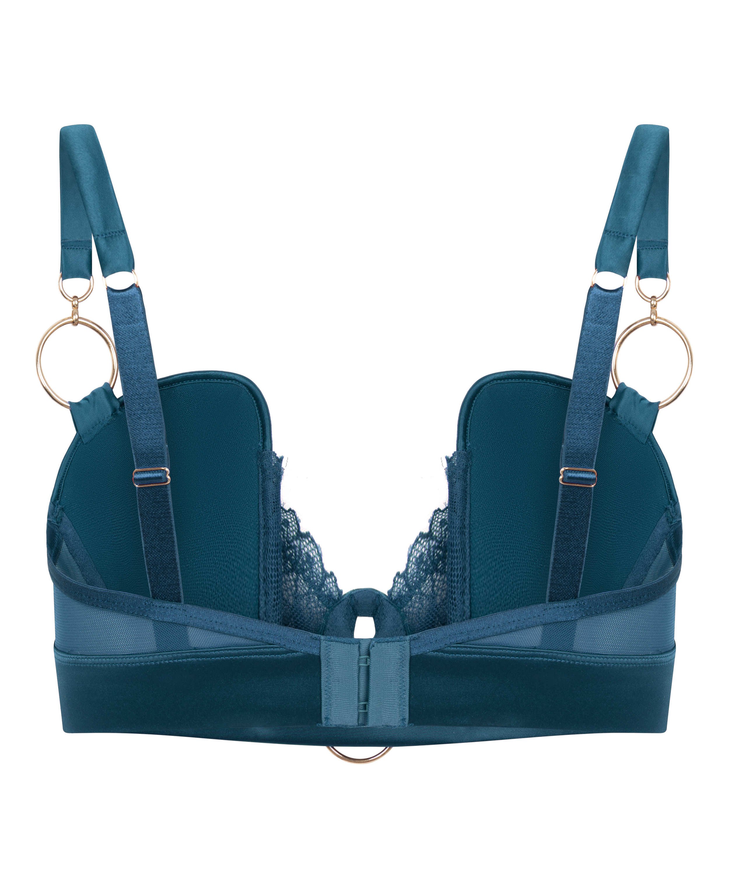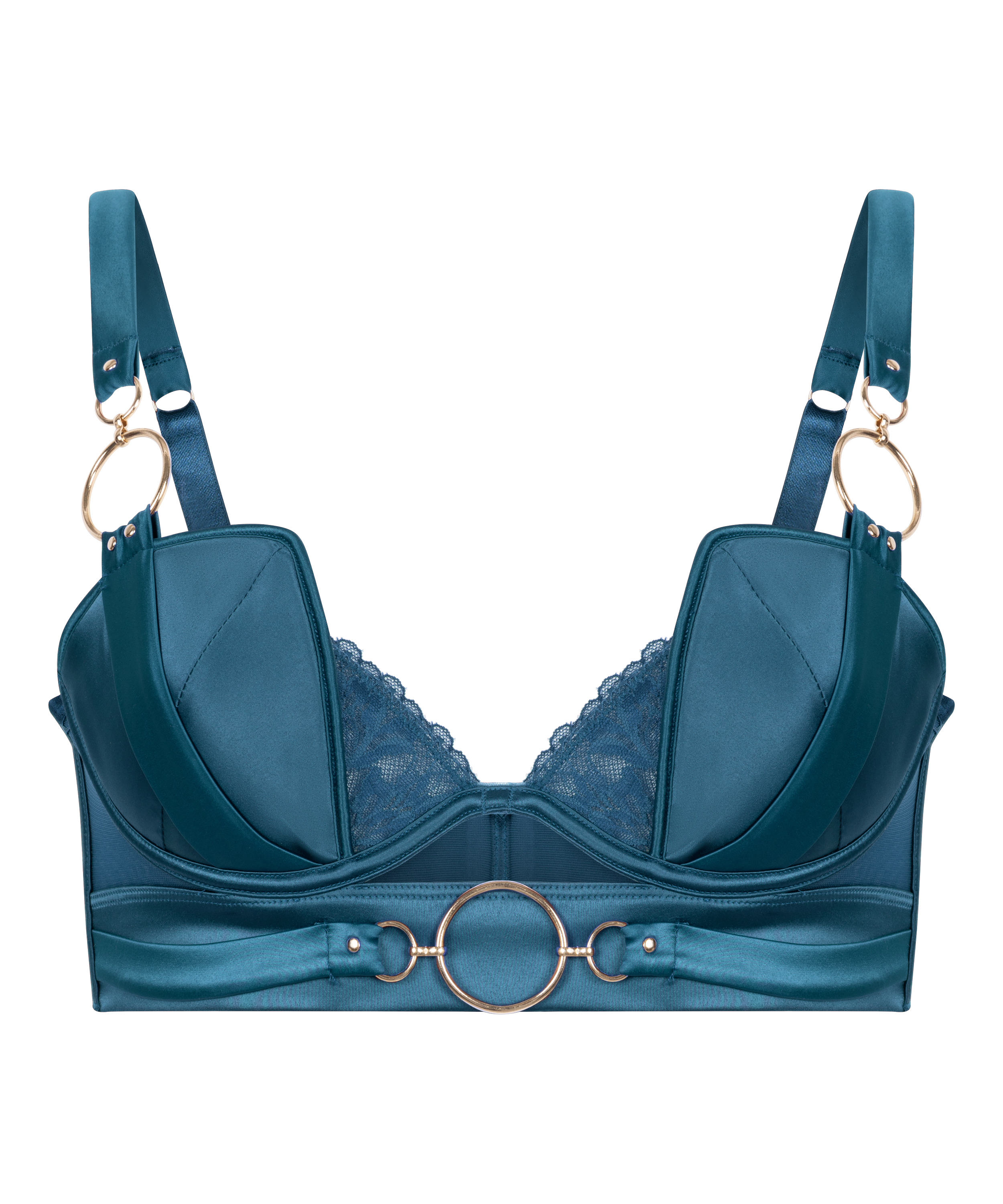 Ένα κομψό και θηλυκό μπλε longline σουτιέν με ενίσχυση και μπανέλα. που προσφέρει ολισθηρό lift και σχήμα στο ντεκολτέ χάρη στις padded cups. Το design συνδυάζει σατέν υφή με διάφανα mesh panels και λεπτομέρειες με χρυσούς κρίκους. δημιουργώντας μια εκλεπτυσμένη και πολυτελή αισθητική.